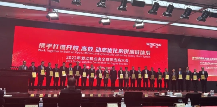 On February 13, at the Weichai Group's 2022 Engine Business Global Supplier Conference with the theme of "Joining Hands to Create an Open, Efficient and Dynamically Optimized Supply Chain System", Tianrun Industrial successfully won the honor of Weichai Power and China National Heavy Duty Truck Group Co., Ltd. The honorary title of "Gold Supplier" in 2021 was awarded. General Manager Xu Chengfei came to the stage to accept the award on behalf of the company, and participated in the launching ceremony of Weichai Quality Award as a guest together with Hu Haihua, Secretary of the Party Committee of Weichai Group.