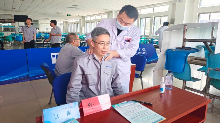 来自山东省文登整骨医院、文登区人民医院、文登区中西医结合医院、环山社区卫生服务中心、文登区皮肤病医院、大水泊中心卫生院、小观镇卫生院、文登区界石镇卫生院等医疗机构的48名医护人员,组成“全科医疗团”,涵盖内科、外科、中医科等主要科室,通过血压测量、中医脉诊、内外科问诊、针灸治疗等方式,为员工提供一对一的健康咨询与专业建议。现场秩序井然,员工们积极参与,并就自身关心的健康问题与医护人员进行了深入交流。